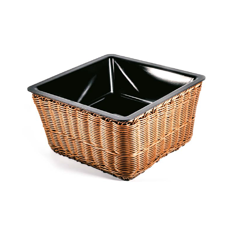 Cesto quadrato con contenitore nero per banco alimentare — robusto, igienico e versatile. Perfetto per esporre e organizzare prodotti sfusi o confezionati in macellerie, gastronomie, panetterie e reparti food con un aspetto professionale e ordinato.